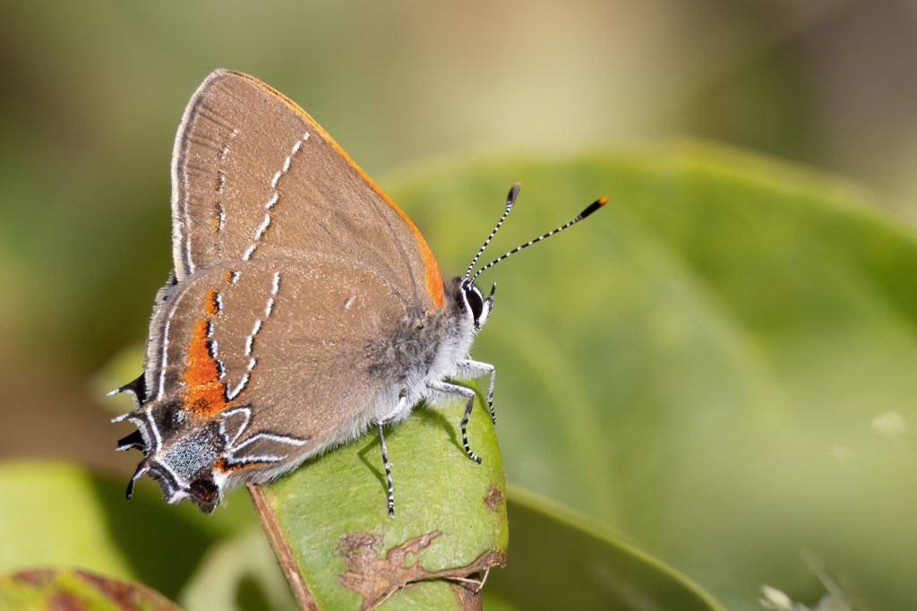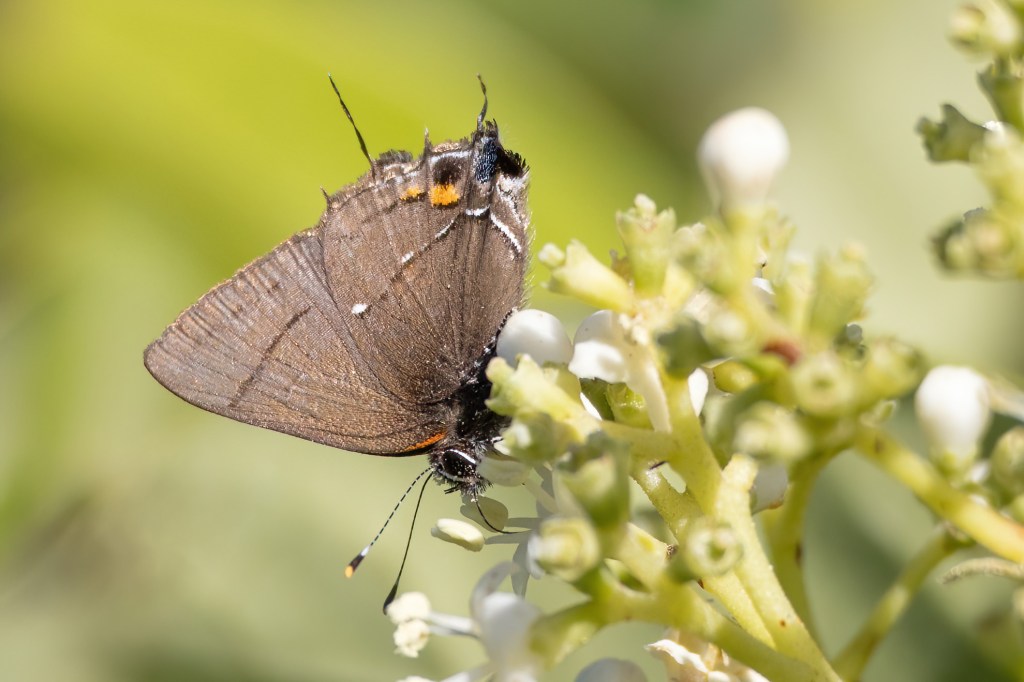 The day was forecast to be a hot one. Mid 90’s or so. So we started the day a little earlier in a neighborhood in Brandon that has a nice row of privet hedge at the beginning of it. Last year, it produced several hairstreak butterflies and this year didn’t disappoint! We found several Southern Oak Hairstreaks, two Fulvous Hairstreaks and a Monk Skipper. There was another small skipper that flew off quickly and we never got an ID on.