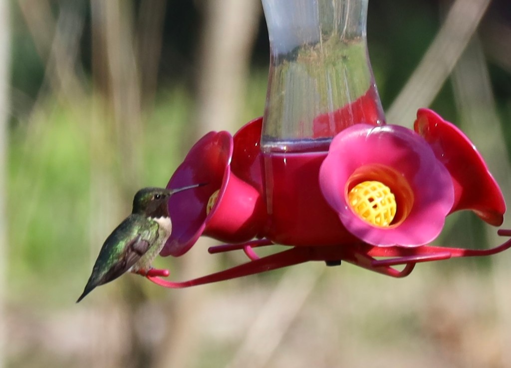 Later on I saw something zip through the yard and I had a feeling it was our first hummingbird. It eventually came down to the feeder. A male ruby throated hummingbird for sure! Always fun to see them return.