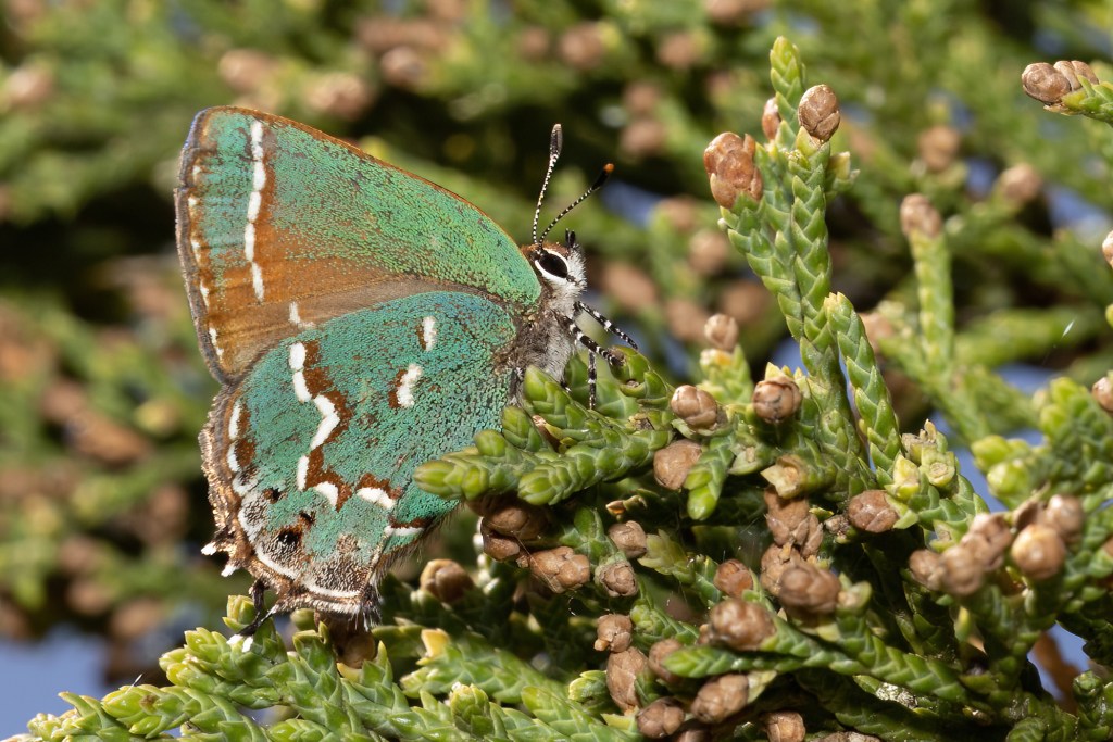 Shortly after getting to the area with several smaller cedar trees, we began seeing the Junipers in high numbers! This year seems to have a very large flight of them as the usual numbers are just a few at a time.