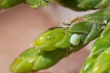 One Juniper was found to be ovipositing on one of the cedars and I was able to get a photo of her and one of her eggs although both photos are less quality than I would like.