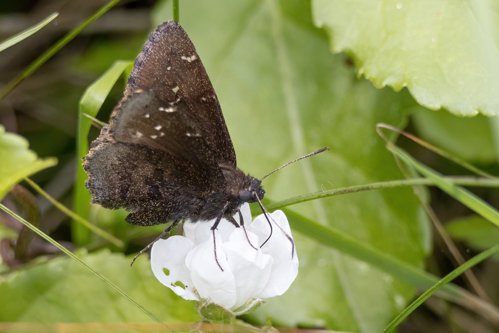 As soon as we got there, we found a Peck’s Skipper and another unknown Skipper laying low in the grass away from the wind. This was to become a common theme throughout the walk. The report we read said “more than 400 Little Wood Satyrs”. We know the people who reported that very well, so we had no reason to doubt it, but couldn’t imagine it. Within about a half hour of arriving, we knew it was an undercount of the amount flying there! They were everywhere. At times, we walked through clouds of them and did our best to not step on them. It was insane.